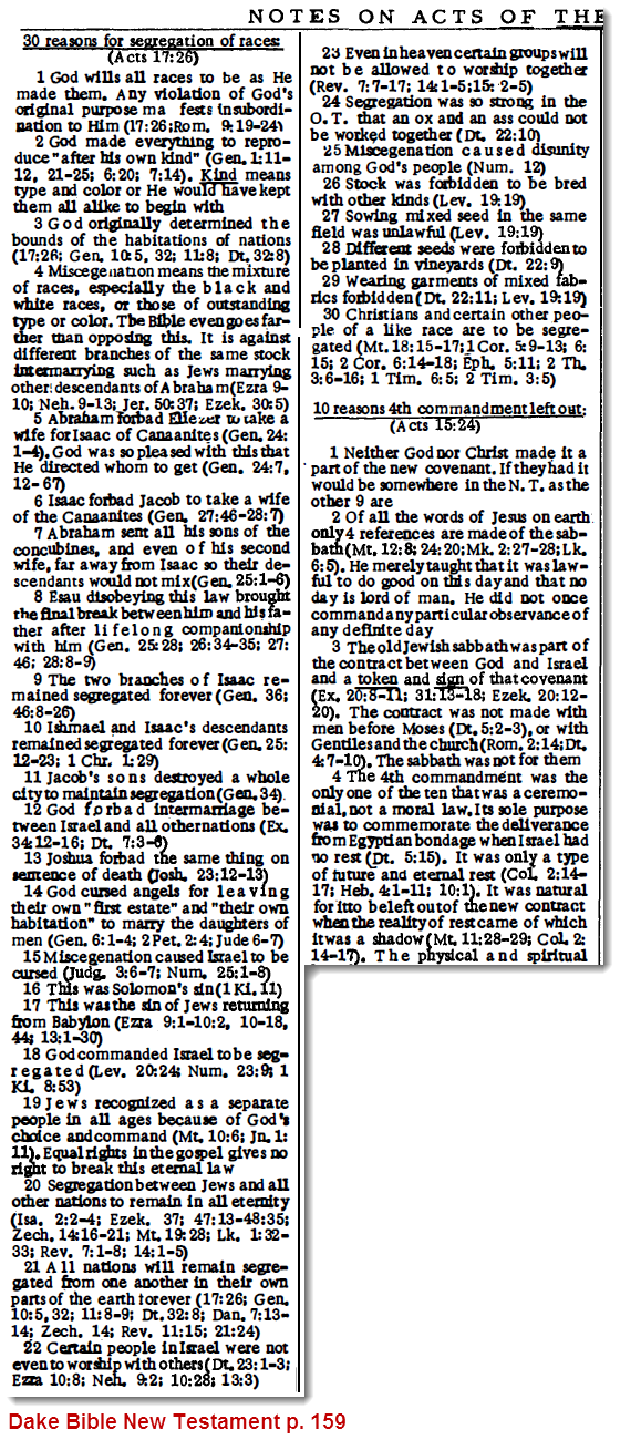 ** Finis Dake maintained his racist teachings until the day he died in 1987. A few years after his death his family quietly removed the racist teachings from his published works. If you have a Dake Bible and can not find the 30 reasons for segregation on p. 159 of his study bible, you likely have a printing later than 1990. In 1990 the family had this removed. He did not remove it himself, in fact he continued to believe it until he died.
