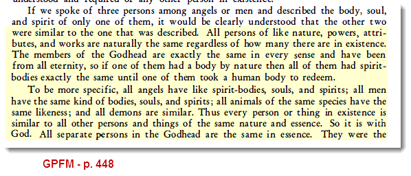 An Anthropological Illustration. Since humankind is made in the image of God (Gen. 1:27), it would seem reasonable that men and women bear some snapshot of the Trinity within their being. One illustration that causes more problems than it solves is to visualize the human being as a “trichotomy” of body, soul, and spirit. Whether the trichotomist position is accurate, this is not a helpful illustration because body and soul are not an indivisible unity. They can be (and are) separated at death (cf. 2 Cor. 5:8; Phil 1:23; Rev. 6:9). The nature and persons of the Trinity cannot be separated. A better illustration based in human nature is the relation between the human mind, its ideas, and the expression of these ideas in words. There is obviously a unity among all three of these without there being an identity. In this sense, they illustrate the Trinity.